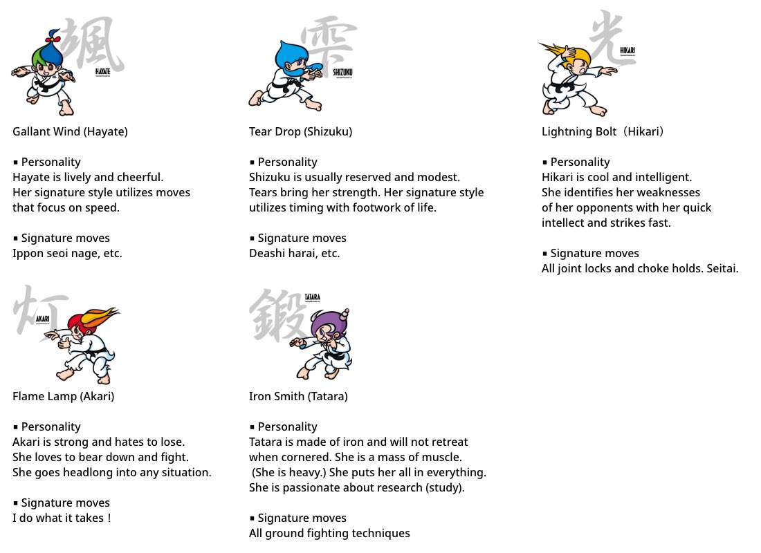 The five characters with distinct personalities aim to be judo champions together with the Komatsu Women's Judo Team through their own signature moves.