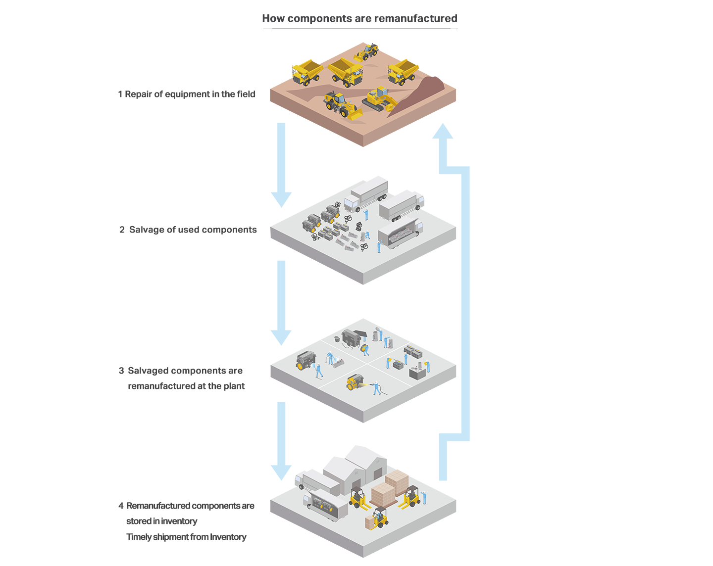 In addition to the development and production of construction equipment, Komatsu positions parts as one of its major businesses. The Komatsu reman business is an important segment within the parts business.