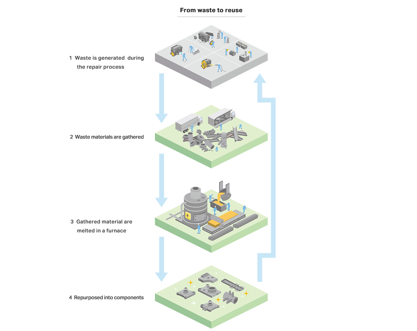 Komatsu reman also enables us to reduce waste, as we melt down unrecyclable parts and metal scraps for reuse. We contribute to reducing CO2 emissions by these practices following the principles of 3R (reduce, reuse, recycle).