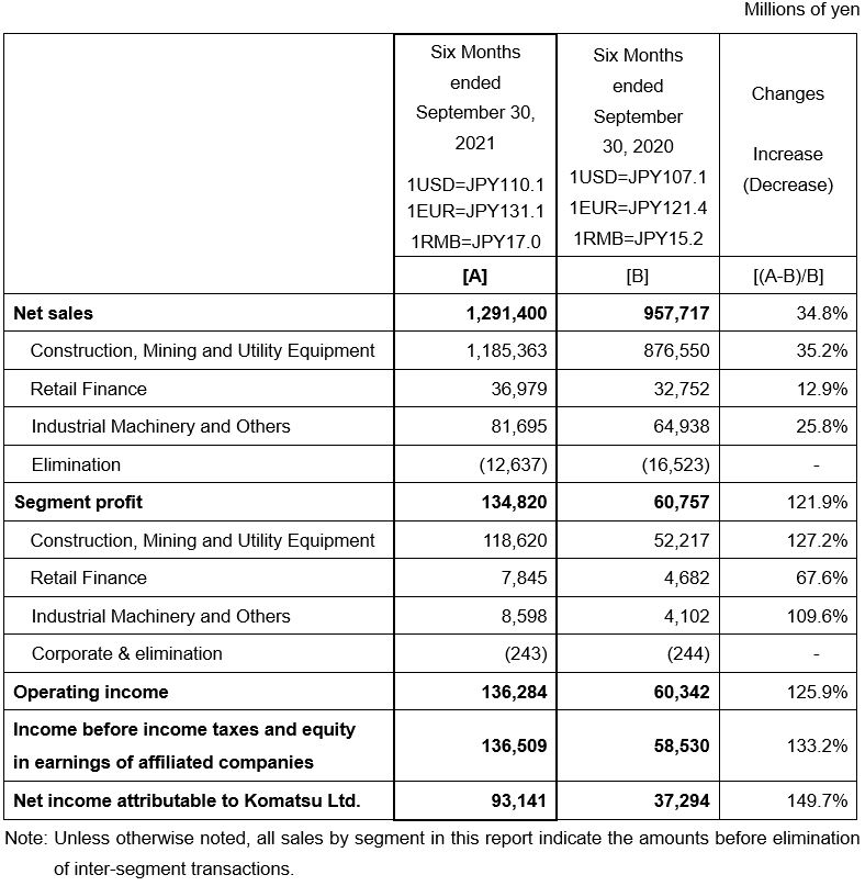 Komatsu Ltd. today announced its consolidated business results for six months of the fiscal year ending March 31, 2022 (U.S. GAAP). The highlights are described below.