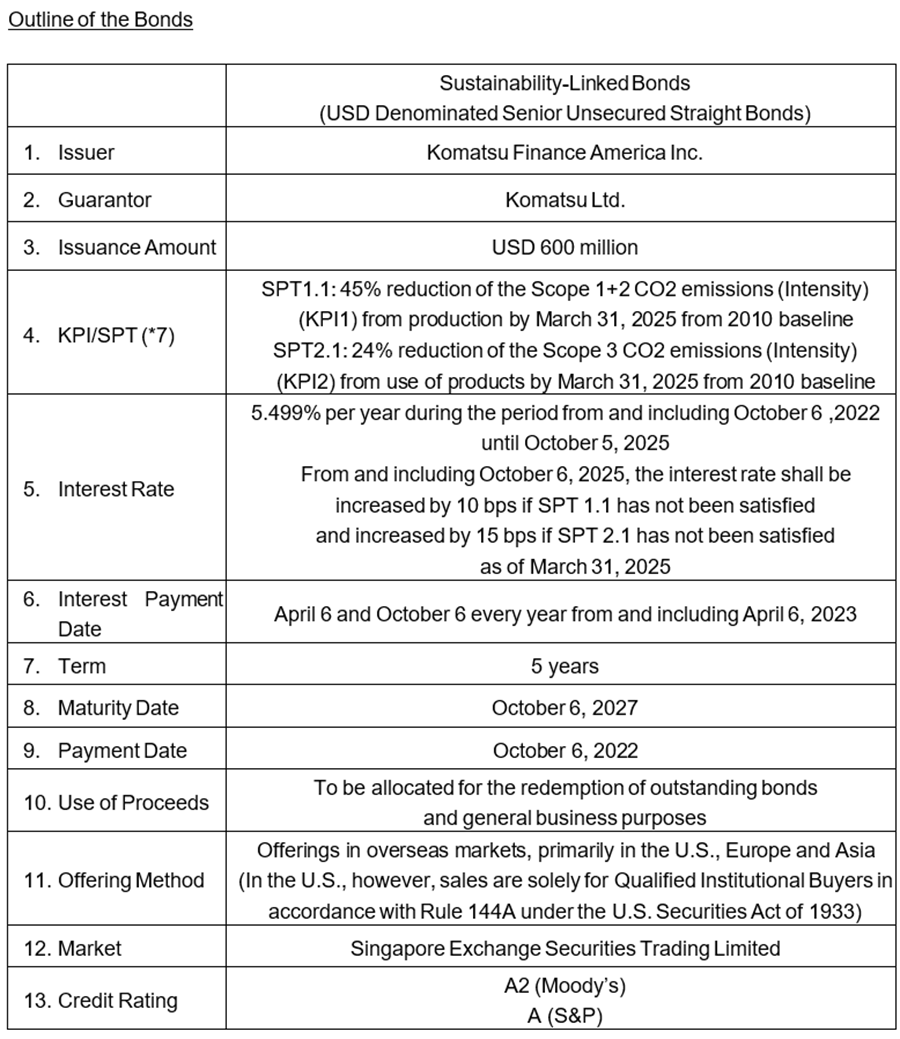 Komatsu Ltd. (President and CEO: Hiroyuki Ogawa) (hereafter “Komatsu”) decided on September 29, 2022, to issue Sustainability-Linked Bonds (USD-Denominated Senior Unsecured Straight Bonds) (hereafter “SLBs”) through Komatsu Finance America Inc., Komatsu’s wholly-owned subsidiary. (*1)