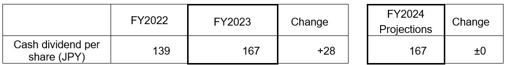 Concerning cash dividends for the fiscal year under review, after considering consolidated business results for the fiscal year under review and future business prospects, the Company is planning to increase the year-end common stock dividend per share by JPY 23 from the earlier projection of JPY 72 per share. As a result, the year-end cash dividend for the fiscal year under review should amount to JPY 95 per share. Annual cash dividends should total JPY 167 per share, including the interim cash dividend which has already been paid, and which shows an increase of JPY 28 per share from the previous fiscal year, ended March 31, 2023. Accordingly, the consolidated payout ratio will translate into 40.1%. This dividend amount will be proposed to the 155th ordinary general meeting of shareholders (scheduled for June 19, 2024).