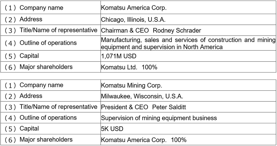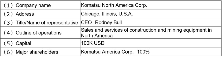 The sales and services functions for construction and mining equipment in North America, currently handled by Komatsu America Corporation ("KAC"), a wholly owned subsidiary of Komatsu in the U.S., and the sales and services functions for mining equipment in North America handled by Komatsu Mining Corporation, a subsidiary of KAC (a sub-subsidiary of Komatsu), will be transferred to a new company (a sub-subsidiary of Komatsu) that KAC will establish in the U.S. As a result, KAC will specialize more in supervising operations for the North American region once the transfer is complete.