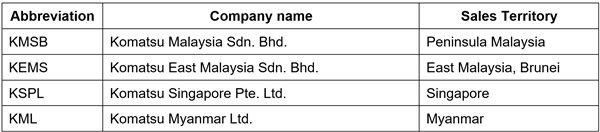 *2: KHMS is the parent company of KMSB, KEMS, KSPL, and KML. The company name of UMW Komatsu Heavy Equipment Sdn. Bhd. had been changed to Komatsu Holdings Malaysia Sdn. Bhd.