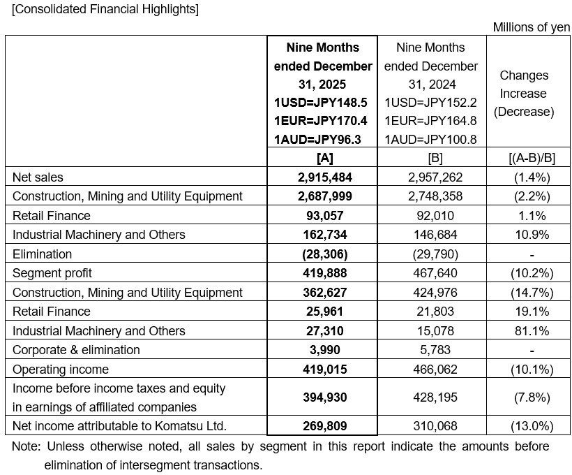 Komatsu Ltd. today announced its consolidated business results for nine months of the fiscal year ending March 31, 2026 (U.S. GAAP). The highlights are described below.