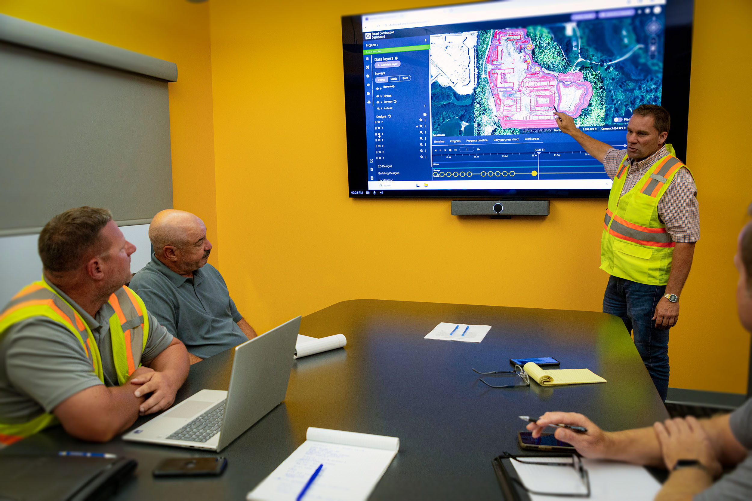 アメリカのある作業現場では、プロジェクトマネージャーが、コマツのデジタルツインを使ってリアルタイムに作業データを共有しています。現場の状況をどこからでも確認でき、「気づき」に活用しています。