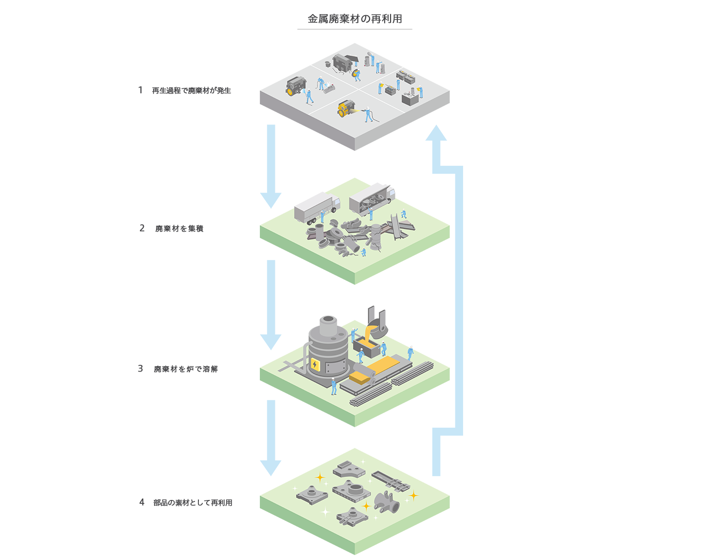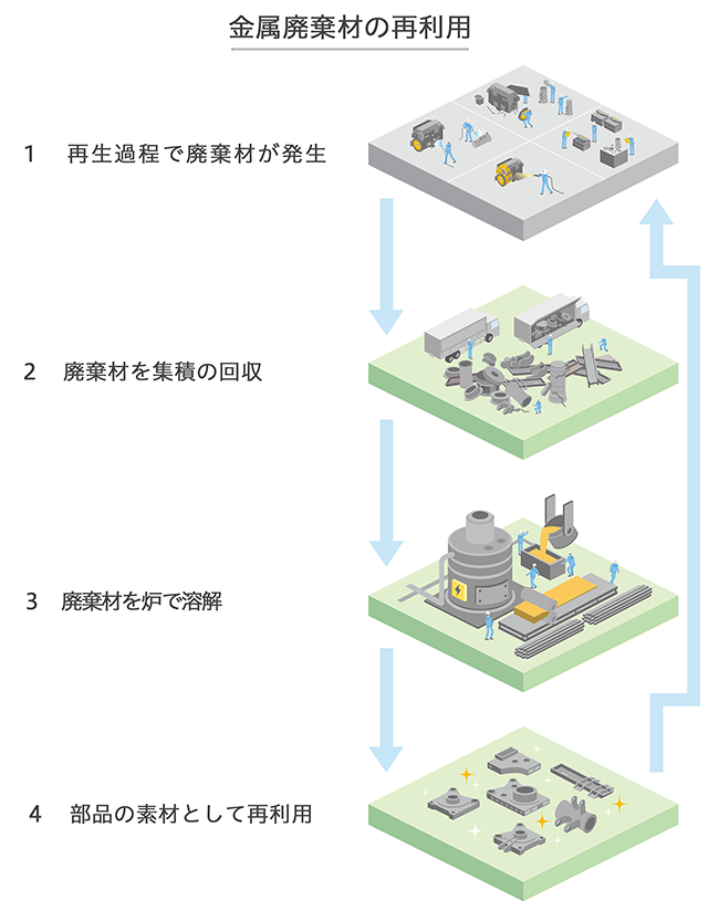 お客さまから回収したコンポーネントを検査し、再生が難しい部品や修復過程で出た鉄材を集め、溶かして再利用します。