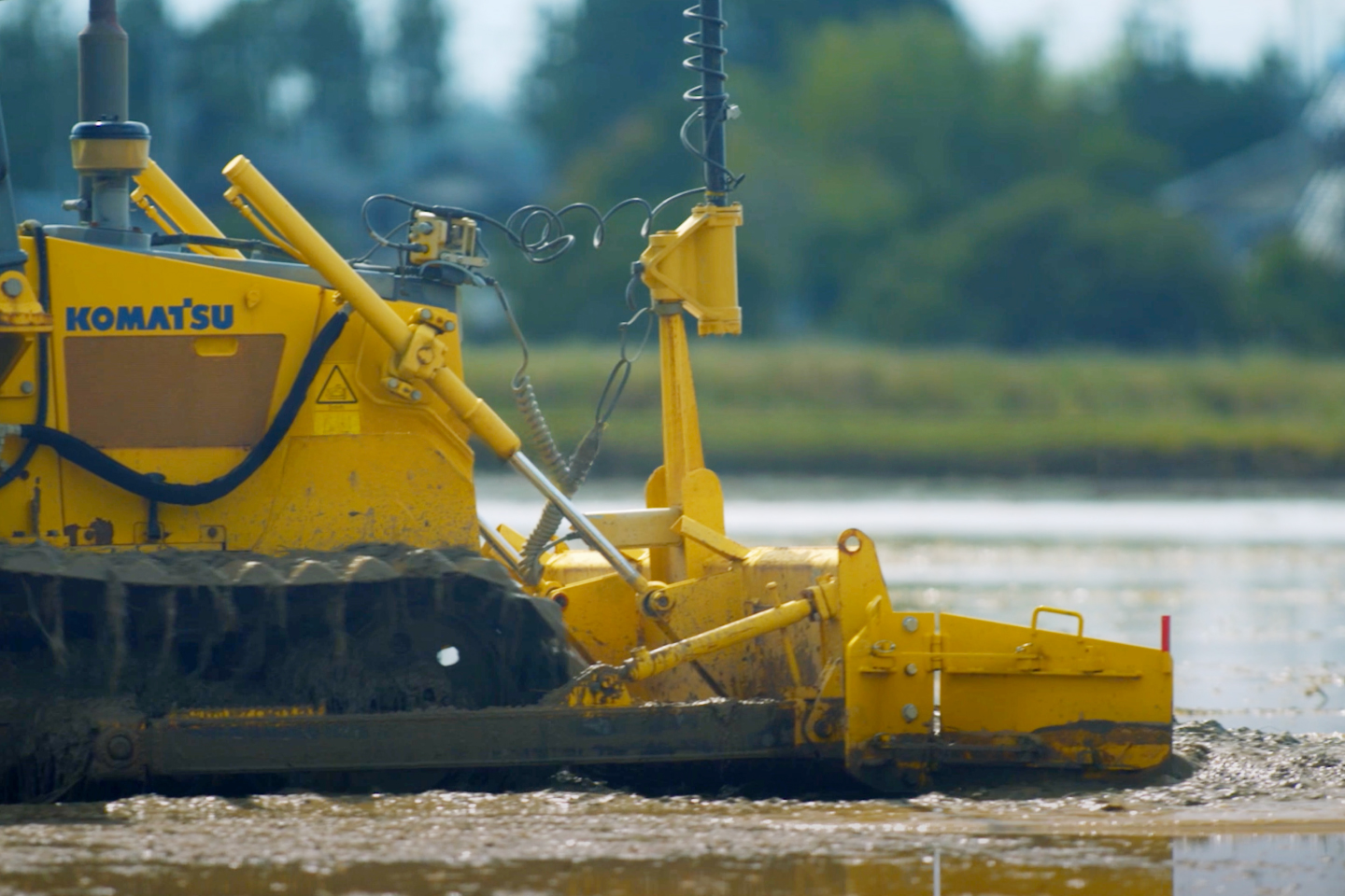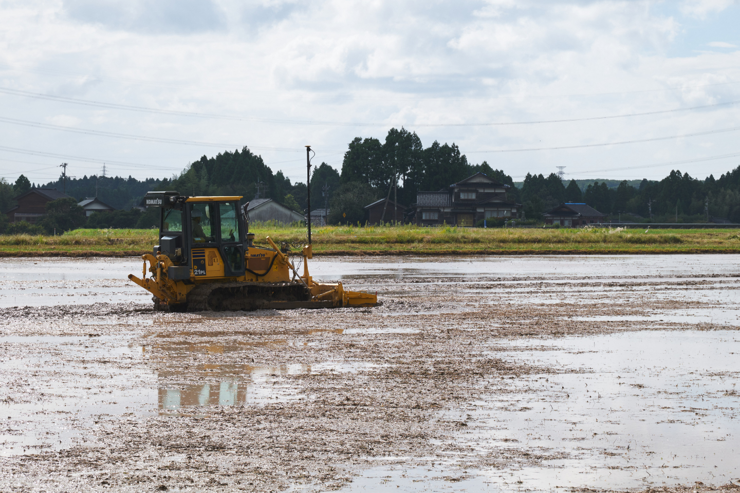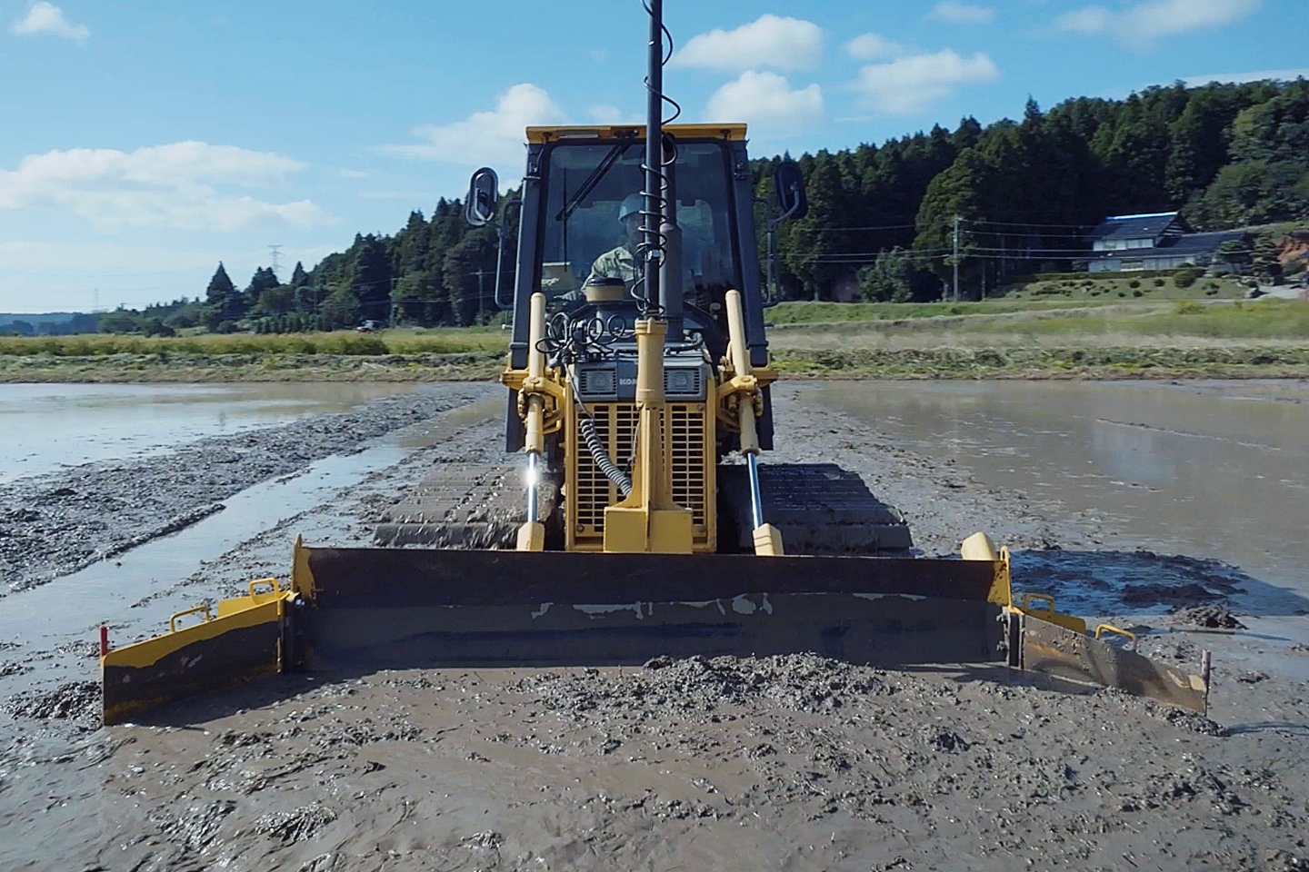 Surveys of the disaster-affected farmland revealed fissures and uneven ground that would prevent the operation of standard agricultural machinery. If the cracks in the rice paddies remain unresolved, the water will drain away, making rice cultivation impossible. Bulldozers are construction machines that excel at leveling the ground and compacting it appropriately, which seems to make them ideal for this challenge.