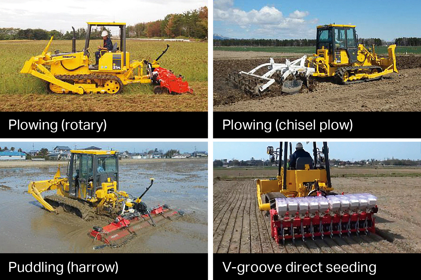 With the 3-point linkage and rear PTO as standard equipment, one unit can handle a wide range of agricultural work, from leveling, plowing and puddling to direct seeding
