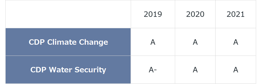 One of the ESG management goals set by Komatsu in “DANTOTSU Value - FORWARD Together for Sustainable Growth,” the new Mid-Term Management Plan that has been carried out since fiscal 2019, is to be selected as an A-list company in reference to CDP’s areas of focus-climate change and water.