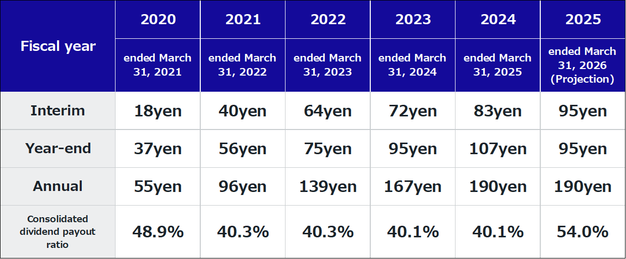 Komatsu is building a sound financial position and enhancing its competitiveness in order to increase its sustainable corporate value. Concerning cash dividends, Komatsu has the policy of continuing stable payment of dividends after comprehensively considering consolidated business results and reviewing future investment plans, cash flows and the like. Specifically, Komatsu has the policy of maintaining a consolidated payout ratio of 40% or higher.