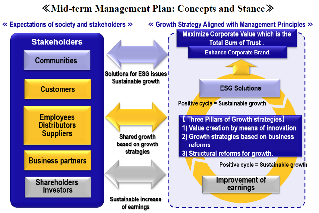 In this new mid-term management plan, we uphold three new pillars of growth strategies of 1) value creation by means of innovation, 2) growth strategies based on business reforms, and 3) structural reforms for growth. By making priority investment in growth areas based on the three pillars of growth strategies, we will strive for sustainable growth through a positive cycle of improving earnings and solving ESG issues without being affected by changes in market demand.