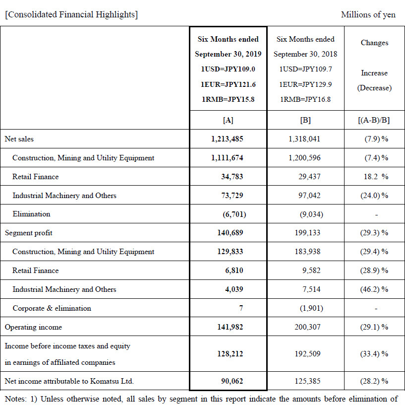 Komatsu Ltd. today announced its consolidated business results for six months of the fiscal year ending March 31, 2020 (U.S. GAAP). The highlights are described below.