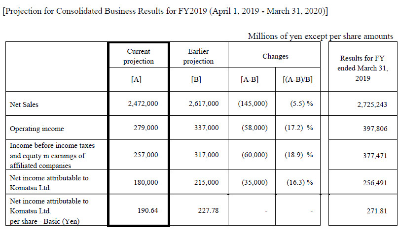 Komatsu makes change in the projection of April 26, 2019, concerning consolidated business results for the fiscal year ending March 31, 2020.