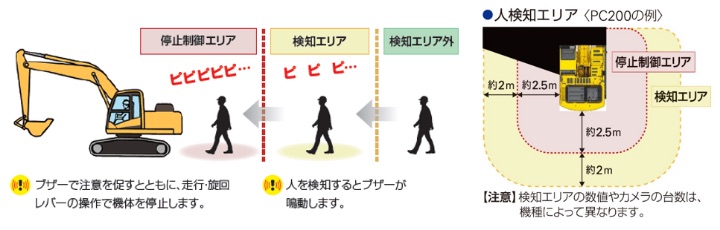 Komatsu has developed this system by upgrading the “KomVision” bird’s eye view camera system equipped with conventional models as standard in the Japanese market. The system recognizes humans around the excavator and prevents the motion of the excavator when the system detects people when the excavator starts to travel or swing. The system also stops the excavator when it detects humans while the excavator is traveling at slow speeds. With these functions, the system helps curb the possibility of collisions between the excavator and people.