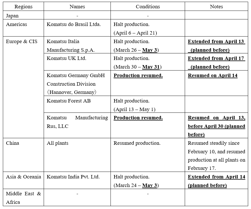 In this release, we revise some information in “Coronavirus (COVID-19) Effects on Komatsu Group’s Business (2)” of April 9 and provide the latest information.