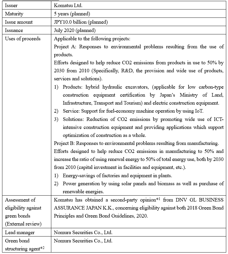 Komatsu Ltd. (hereafter “Komatsu”) (President and CEO: Hiroyuki Ogawa) is going to issue a “green bond”, an unsecured straight bond, through a public offering on the Japanese market. Green bonds are designed to raise funds for exclusive use in business which works to help solve environmental problems. This is Komatsu’s first “green bond” issuance.
