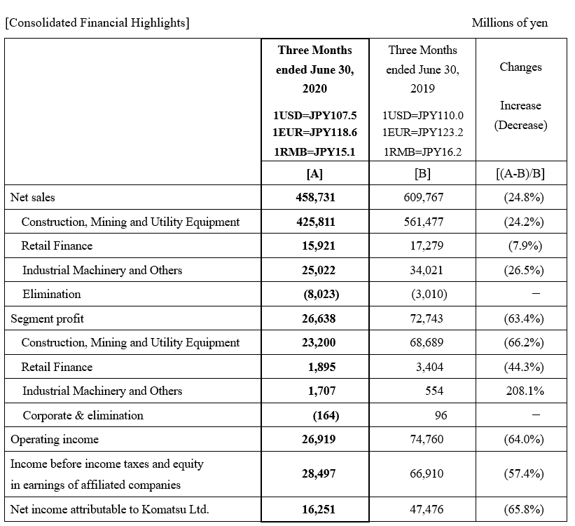 For the first three-month period (April 1- June 30, 2020) of the fiscal year ending March 31, 2021, the second year of the mid-term management plan, consolidated net sales totaled JPY 458.7 billion, down 24.8% from the corresponding period a year ago. In the construction, mining and utility equipment business, demand fell, centering on North America, Europe and Asia, as particularly affected by the coronavirus (COVID-19) pandemic. As a result, sales declined from the corresponding period a year ago. In the industrial machinery and others business, demand for presses, sheet-metal machines, and machine tools fell against the coronavirus (COVID-19) pandemic. As a result, sales fell from the corresponding period a year ago.