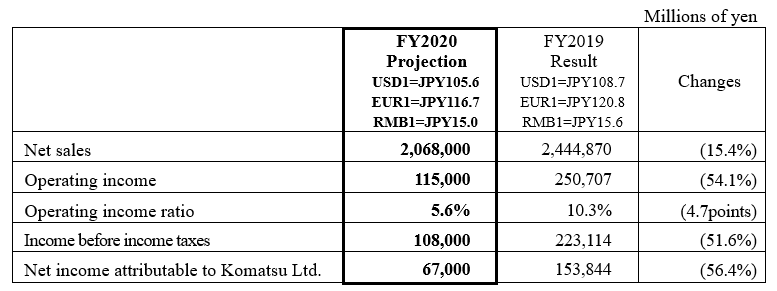 Concerning the projection for the fiscal year ending March 31, 2021, which was undecided in the “Consolidated Business Results for the Fiscal Year Ended March 31, 2020 (U.S. GAAP)”, which Komatsu announced on May 18, 2020, Komatsu has calculated the projections based on information and predictions which are available as of today, and is projecting a decline in both sales and profits as follows.