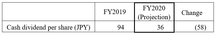 As described earlier in this report, Komatsu anticipates that demand will decline in all regions, except for China, mainly in the construction, mining and utility equipment business, as affected by the coronavirus (COVID-19) pandemic. Accordingly, Komatsu projects a decline in both consolidated sales and profits. Concerning the projection of cash dividends for the year, which was undecided in the “Consolidated Business Results for the Fiscal Year Ended March 31, 2020 (U.S. GAAP)”, that Komatsu announced on May 18, 2020, Komatsu plans to pay JPY 18 per share for the interim dividend and JPY 18 for the year-end dividend. This was based on the above-mentioned basic policy after considering consolidated business results, and reviewing future business prospects. Therefore, the annual dividends will total JPY 36 per share, a decline from JPY 58 for the previous fiscal year ended March 31, 2020, and the consolidated payout ratio will become 50.8%.