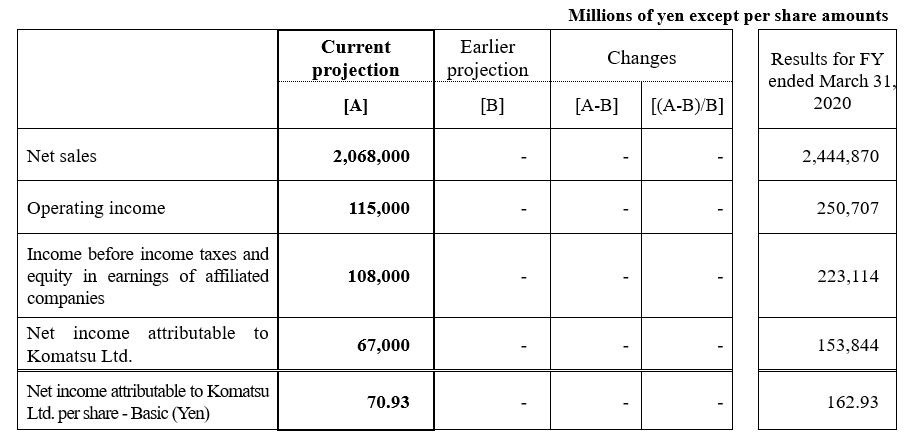 Concerning the projection for the fiscal year ending March 31, 2021, which was undecided in the “Consolidated Business Results for the Fiscal Year Ended March 31, 2020 (U.S. GAAP)”, which Komatsu announced on May 18, 2020, Komatsu has calculated the projections based on information and predictions which are available as of today, and is projecting a decline in both sales and profits as follows.
