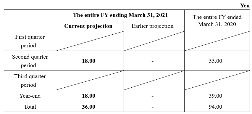 As described earlier in this announcement, Komatsu anticipates that demand will decline in all regions, except for China, mainly in the construction, mining and utility equipment business, as affected by the coronavirus (COVID-19) pandemic. Accordingly, Komatsu projects a decline in both consolidated sales and profits. Concerning the projection of cash dividends for the year, which was undecided in the “Consolidated Business Results for the Fiscal Year Ended March 31, 2020 (U.S. GAAP)”, that Komatsu announced on May 18, 2020, Komatsu plans to pay JPY 18 per share for the interim dividend and JPY 18 for the year-end dividend. This was based on the above-mentioned basic policy after considering consolidated business results, and reviewing future business prospects. Therefore, the annual dividends will total JPY 36 per share, a decline from JPY 58 for the previous fiscal year ended March 31, 2020, and the consolidated payout ratio will become 50.8%.