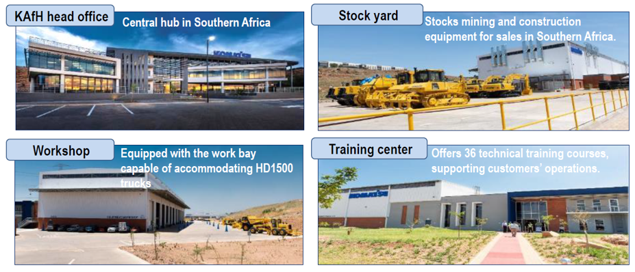 Note 1: The head office campus of Komatsu Africa Holdings: By this general term, we mean that we have consolidated different functions at one location, such as the headquarters building, parts depot, workshop, training center, and the Reman plant, which had previously been geographically dispersed.