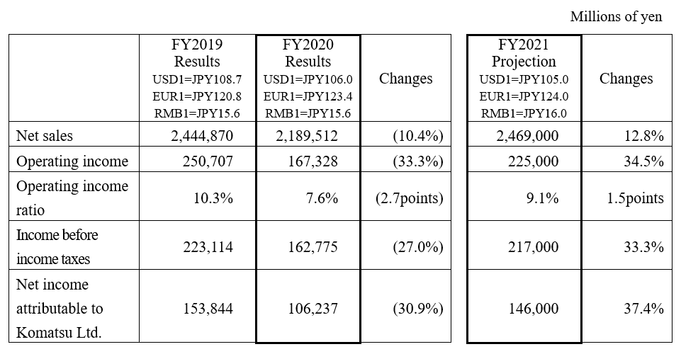 Komatsu Ltd. today announced its consolidated business results for the fiscal year ended March 31, 2021 (U.S. GAAP). The highlights are described below.