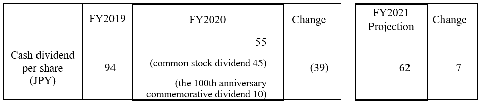 Concerning cash dividends for the fiscal year under review, after considering consolidated business results for the fiscal year under review and future business prospects, Komatsu Ltd. is planning to increase the year-end common stock dividend per share by JPY 2 from the earlier projection of JPY 25 per share. At the same time, Komatsu Ltd. plans to pay the 100th anniversary (May 13, 2021) commemorative cash dividend of JPY 10 per share. As a result, year-end cash dividends for the fiscal year under review should amount to JPY 37 per share, i.e., JPY 12 more than the latest projection of cash dividends. Annual cash dividends should total JPY 55 per share, including the interim cash dividend which has already been paid, and which is showing a decrease of JPY 39 per share from the previous fiscal year, ended March 31, 2020. Accordingly, the consolidated payout ratio will translate into 48.9%. This dividend amount will be proposed to the 152nd ordinary general meeting of shareholders (scheduled for June 18, 2021).