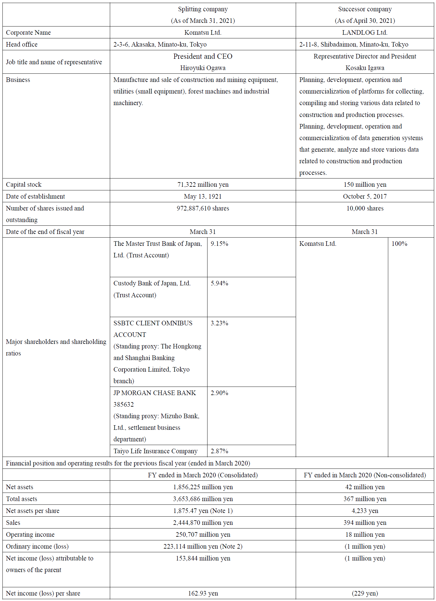 There will be no change due to the Company Split in the name, location, job title and name of representative, scope of business, capital stock and fiscal year of LANDLOG as the successor company; however, please note that LANDLOG will change its corporate name to “EARTHBRAIN Ltd.” on July 1, 2021 (scheduled).