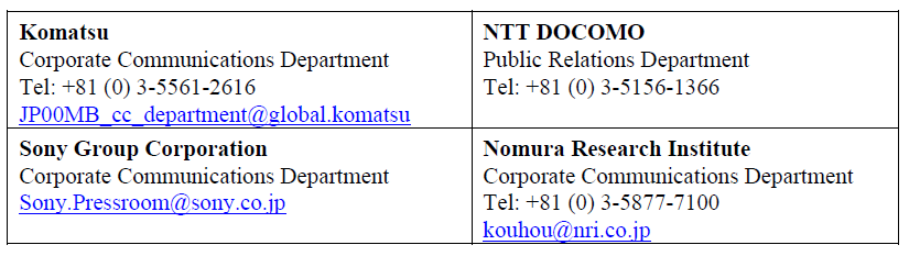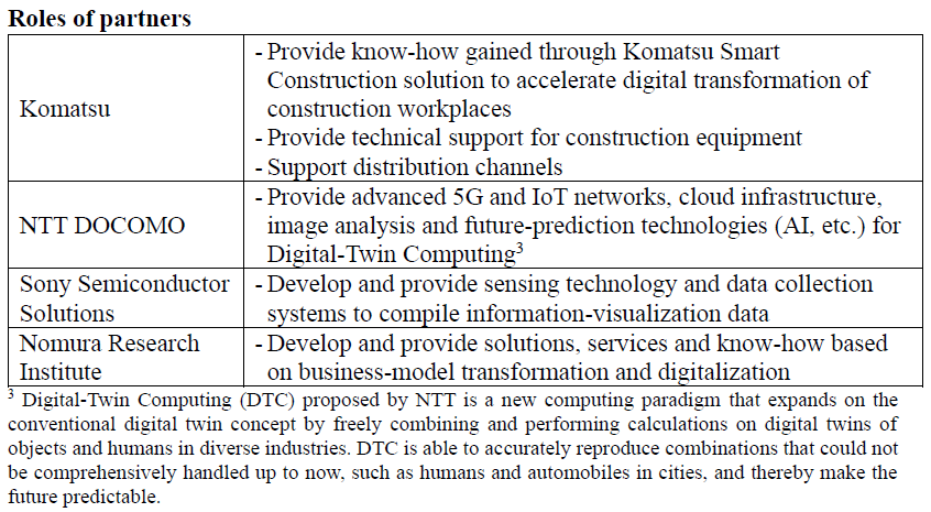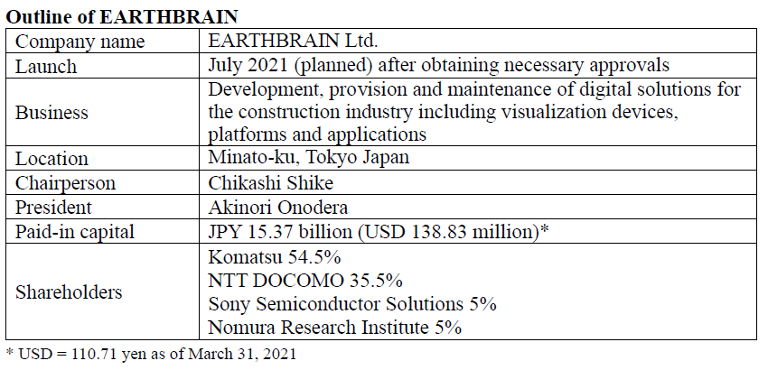 TOKYO, JAPAN, April 30, 2021 — Komatsu Ltd., NTT DOCOMO, INC., Sony Semiconductor Solutions Corporation and Nomura Research Institute, Ltd. jointly announced today that they have agreed to launch a new company, named EARTHBRAIN Ltd., that will support digital transformation in the construction industry for dramatically improved safety, productivity and environmental performance.