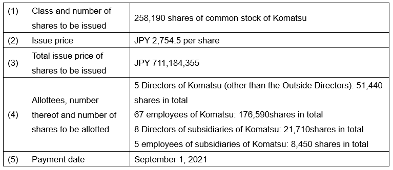 Komatsu Ltd. (“Komatsu”) hereby announces that, in relation to the issuance of new shares as restricted stock compensation, which was resolved by the Board of Directors at its meeting held on July 16, 2021, the procedure for payment was completed today, as below. For details, please refer to “Announcement Regarding Issuance of New Shares as Restricted Stock Compensation” dated July 16, 2021.