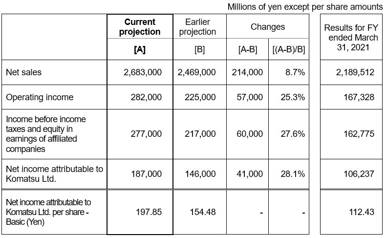 Komatsu makes change in the projection of April 30, 2021, concerning consolidated business results for the fiscal year ending March 31, 2022.