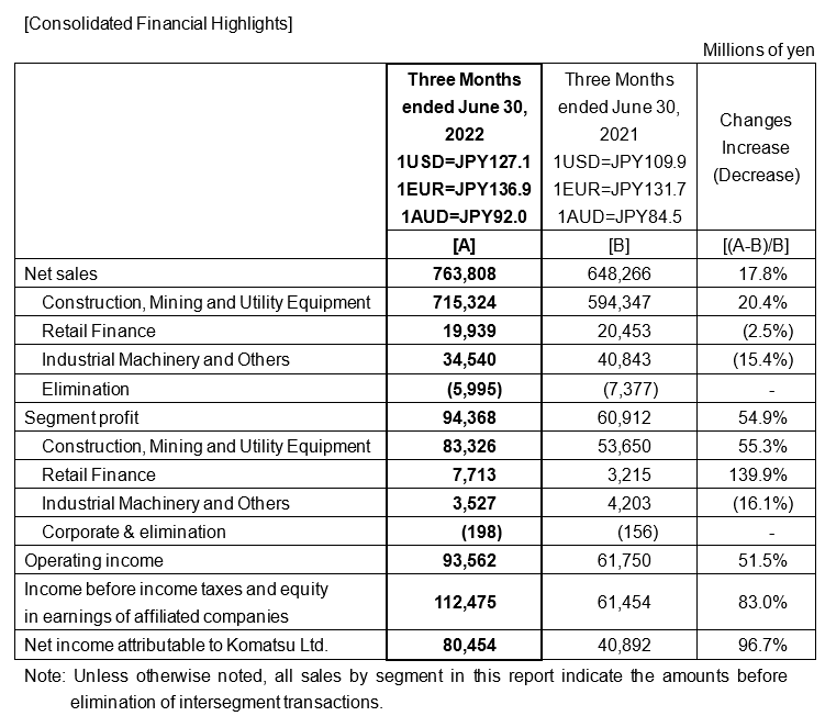 Komatsu Ltd. today announced its consolidated business results for three months of the fiscal year ending March 31, 2023 (U.S. GAAP). The highlights are described below.