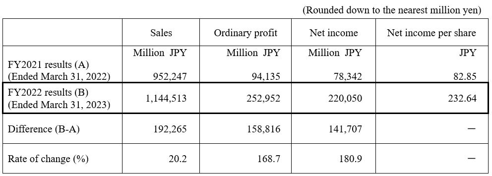 1. Difference between non-consolidated results for the fiscal year ended March 31, 2023 and those for the previous fiscal year (April 1, 2022 to March 31, 2023)