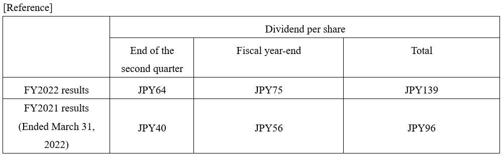 Concerning cash dividends for the fiscal year under review, after considering consolidated business results for the fiscal year under review and future business prospects under its dividend policy, the Company is planning to increase the year-end common stock dividend per share by JPY 11 from the earlier projection of JPY 64 per share. As a result, the year-end cash dividend for the fiscal year under review should amount to JPY 75 per share. Annual cash dividends should total JPY 139 per share, including the interim cash dividend which has already been paid, and which shows an increase of JPY 43 per share from the previous fiscal year, ended March 31, 2022. Accordingly, the consolidated payout ratio will translate into 40.3%. This dividend amount will be proposed to the 154th ordinary general meeting of shareholders (scheduled for June 21, 2023).
