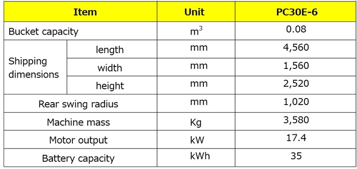 This new machine is a fully remodeled version of the “PC30E-5” a 3-ton class electric mini excavator which was introduced as a rental model in the Japanese market in 2020. While maintaining the current machine's features of zero exhaust gas, heat emissions and low noise, the new machine is equipped with a lithium-ion battery in place of a lead-acid battery, which extends its operating hours and makes the vehicle more compact and lightweight, thereby improving the convenience for customers.