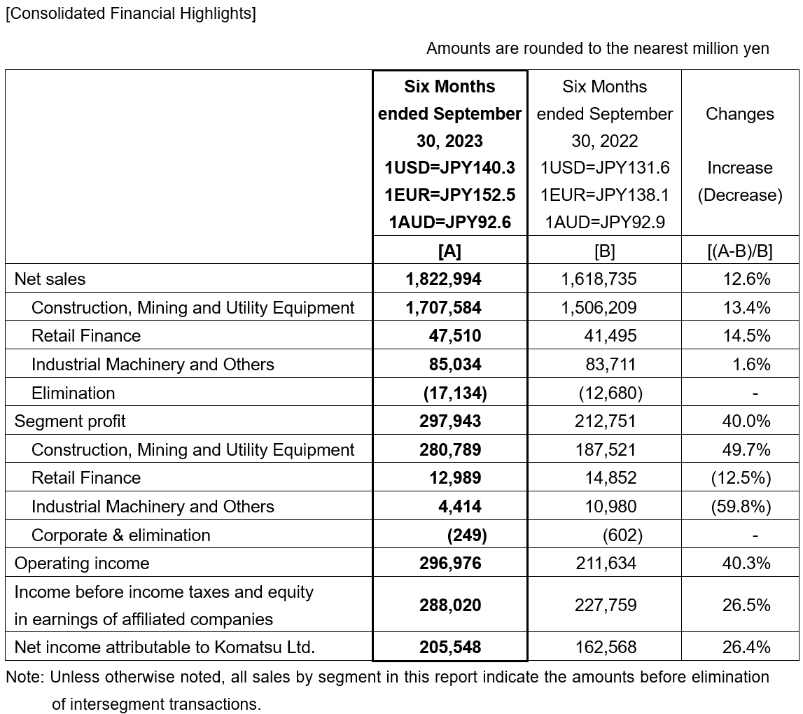 Komatsu Ltd. today announced its consolidated business results for six months of the fiscal year ending March 31, 2024 (U.S. GAAP). The highlights are described below.