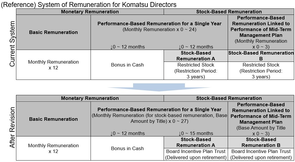 The remuneration for Komatsu Directors comprises basic remuneration and performance-based remuneration linked to consolidated performance for a single fiscal year (bonus in cash and the Stock-Based Remuneration A) as well as the performance-based remuneration that reflect the degree of achievement of the targets raised in the mid-term management plan (Stock-Based Remuneration B). The purpose of the revisions to the Plan is to further increase the desire to contribute to enhancing Komatsu’s medium- to long-term results and to boosting its corporate value by increasing the ratio of stock-based remuneration for Directors and delivering stocks to Eligible Persons at their retirement, as well as to align interests with our shareholders. Specifically, the revisions will increase the maximum amount of remuneration linked to consolidated performance for a single fiscal year (Stock-Based Remuneration A) paid from 12 months’ worth of monthly remuneration to 15 months’ worth of monthly remuneration. As a result of this change, the maximum amount of remuneration linked to consolidated performance for a single fiscal year (bonus in cash and the Stock-Based Remuneration A) will increase from 24 months’ worth of monthly remuneration to 27 months’ worth of monthly remuneration.