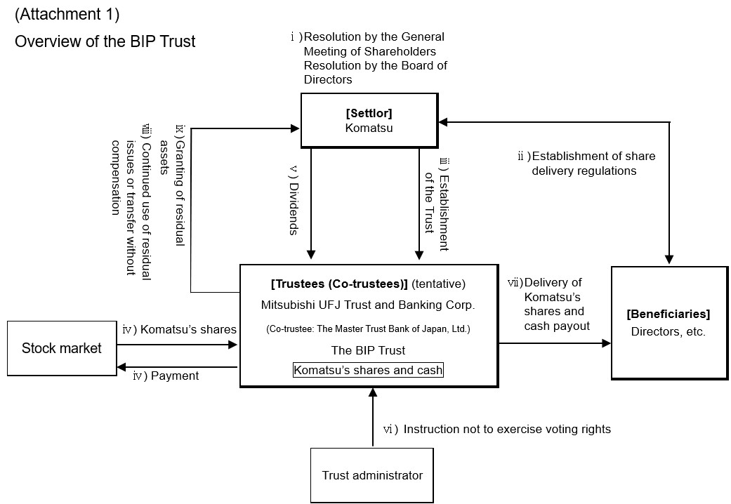 iii) Komatsu will entrust money for the remuneration of the Komatsu Directors and Affiliated Company Directors (hereinafter “Directors, etc.”) borne by the Subject Companies within the upper limit approved by a resolution at their respective Shareholders Meetings as in i) above and establish a trust wherein the Directors, etc. who meet the beneficiary requirements are beneficiaries (hereinafter the “BIP Trust”).