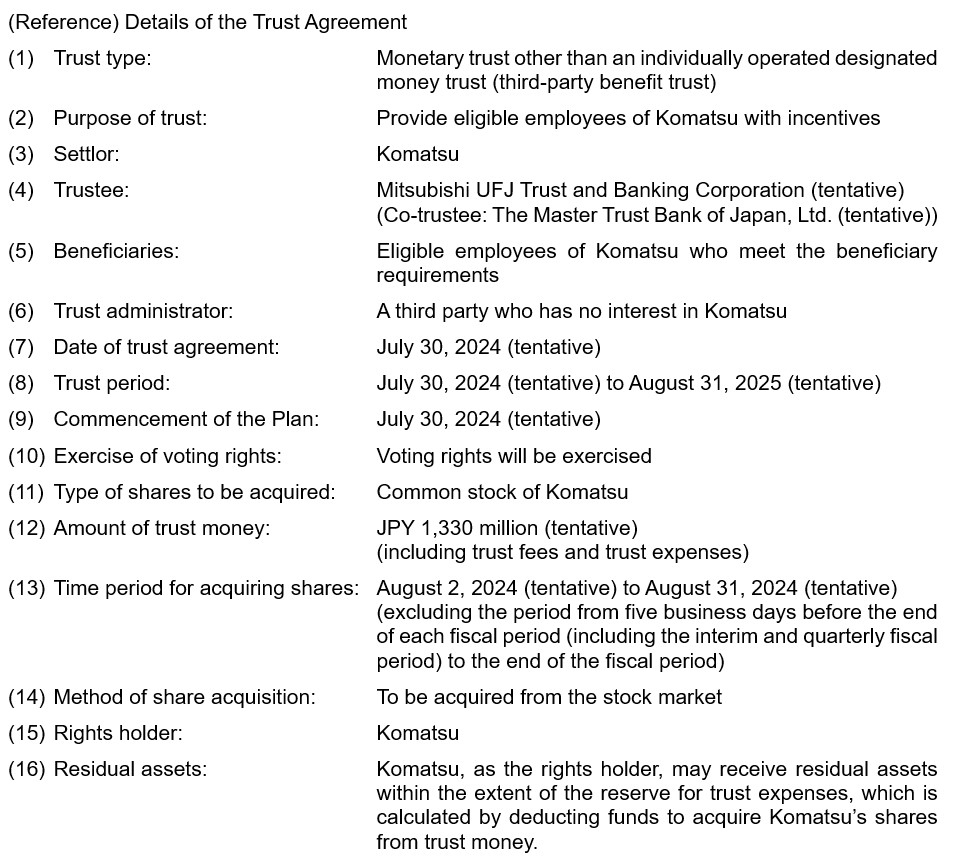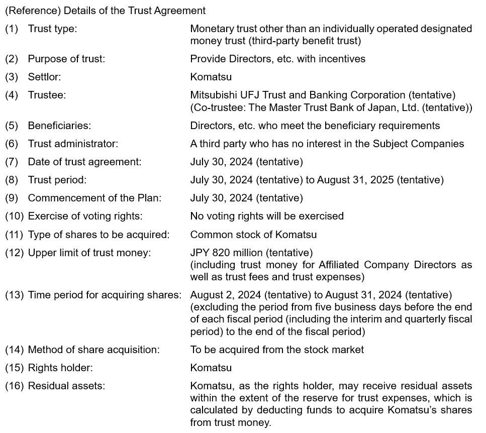 (4) Where the trust period for the BIP Trust and ESOP Trust (hereinafter the “Trust”) established through the implementation of the Plan has been completed, a new Trust will be established, and Komatsu plans to continuously implement the Plan through changes to the existing Trust that has completed its trust period and additional trusts.