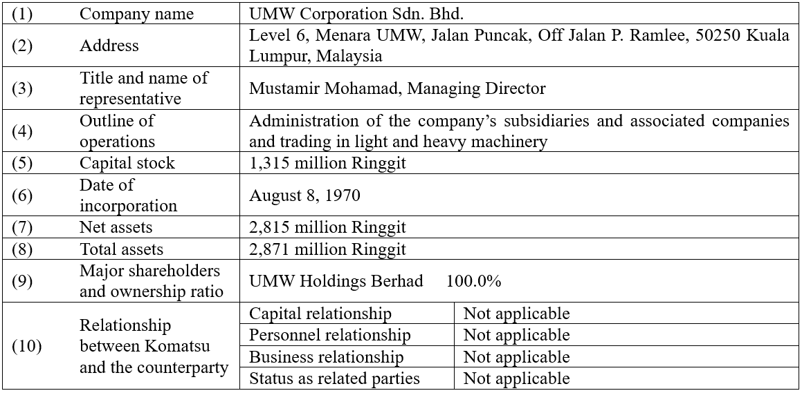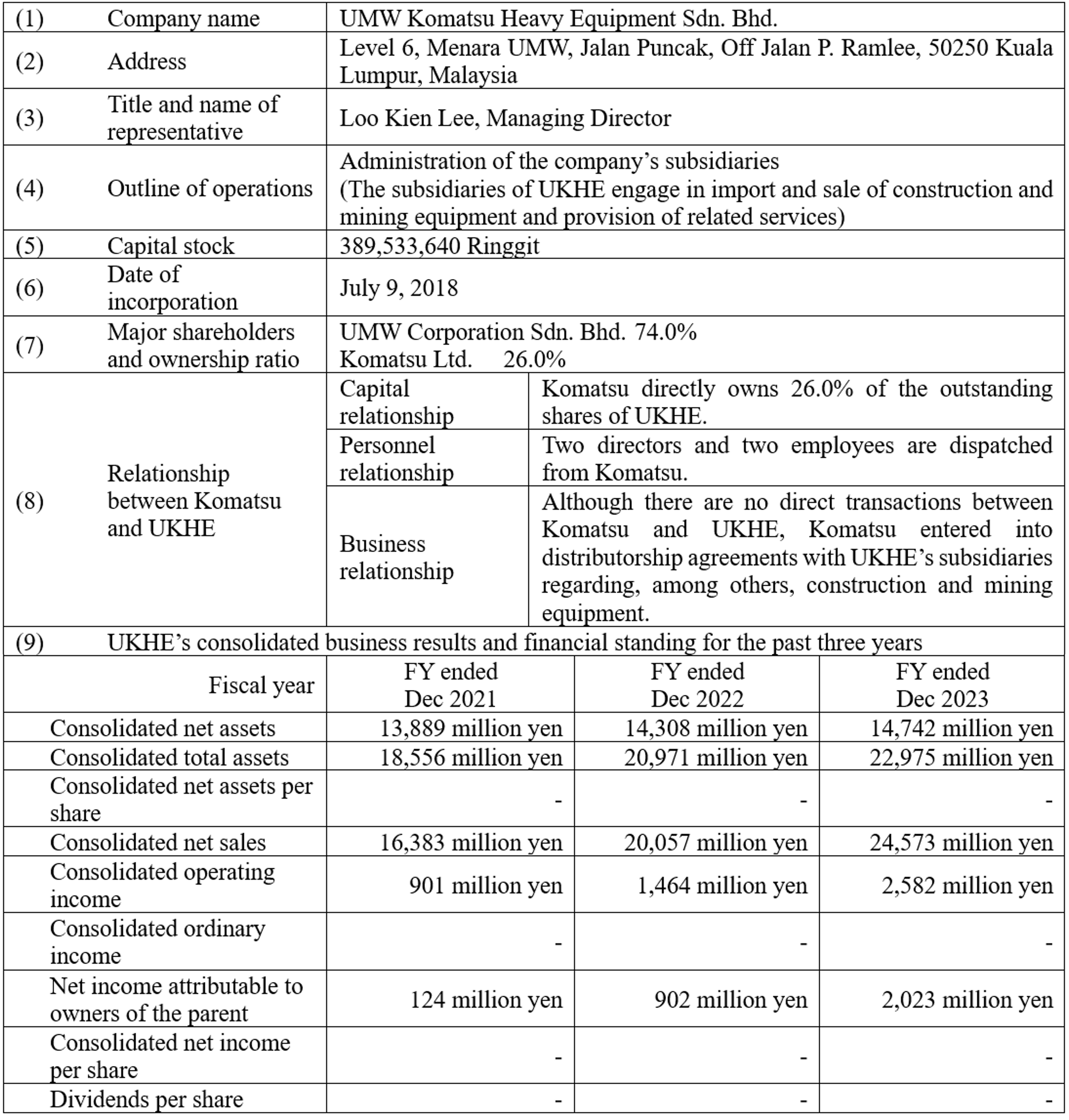 2. Outline of company to be converted into subsidiary (UMW Komatsu Heavy Equipment Sdn. Bhd.)