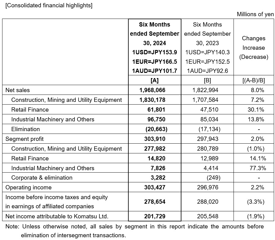 For the first six-month period (April 1- September 30, 2024) of the fiscal year ending March 31, 2025, consolidated net sales totaled JPY 1,968.1 billion, an increase of 8.0% from the corresponding period a year ago. In the construction, mining and utility equipment business, while sales for construction equipment decreased, that for mining equipment increased. There was also the impact of the Japanese yen's depreciation and the effect of improved selling prices in most regions of the world, thereby sales increased from the corresponding period a year ago. In the industrial machinery and others business, sales increased from the corresponding period a year ago, supported primarily by increased sales of large presses for the automobile manufacturing industry and increased maintenance sales in the excimer laser-related business for the semiconductor industry.