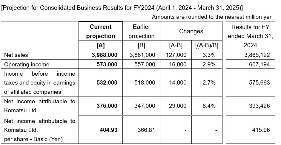 As Komatsu projects business results to outperform its initial projection announced on April 26, 2024, due to the Japanese yen’s more-than-anticipated depreciation during the first six-month period, it has revised projected consolidated sales and profits for the fiscal year ending March 31, 2025.