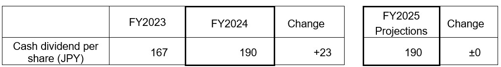Concerning cash dividends for the fiscal year under review, after considering consolidated business results for the fiscal year under review and future business prospects, the Company is planning to increase the year-end common stock dividend per share by JPY 23 from the earlier projection of JPY 84 per share. As a result, the year-end cash dividend for the fiscal year under review should amount to JPY 107 per share. Annual cash dividends should total JPY 190 per share, including the interim cash dividend which has already been paid, and which shows an increase of JPY 23 per share from the previous fiscal year, ended March 31, 2024. Accordingly, the consolidated payout ratio will translate into 40.1%. This dividend amount will be proposed to the 156th ordinary general meeting of shareholders (scheduled for June 19, 2025).