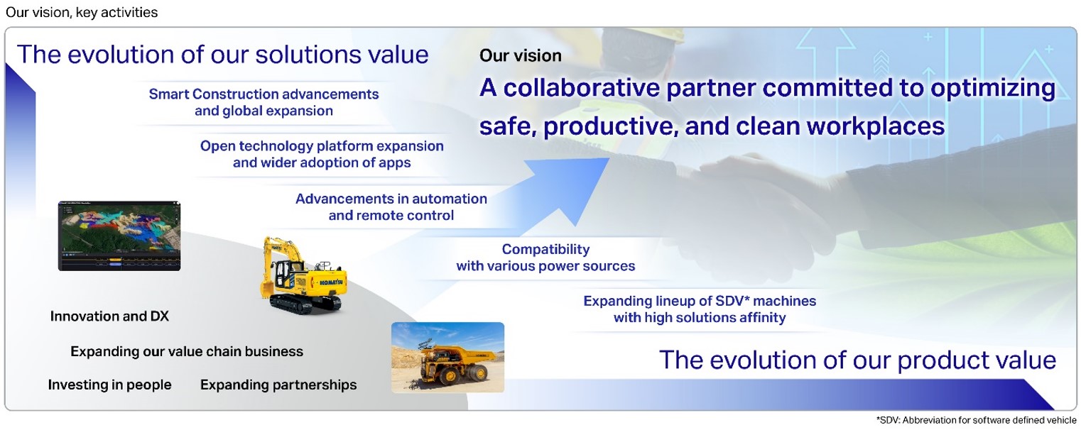 Under this new medium-term management plan, Komatsu aims to embrace one of its core values, Ambition, by taking bold measures to pursue group-wide growth through the co-creation of new value with customers and stakeholders. The Strategic Growth Plan redefines the Company vision of becoming a collaborative partner committed to optimizing safe, productive, and clean workplaces. Komatsu will further evolve its solutions (e.g., Smart Construction and Autonomous Haulage System (AHS)) with more advanced products compatible with them and deliver new value to optimize customer job sites.