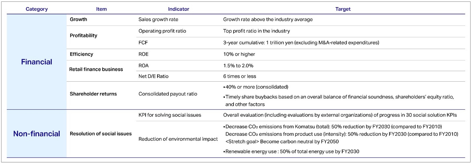 For non-financial targets, Komatsu continues to pursue its 2030 CO₂ reduction goal and 2050 carbon neutrality challenging target to reduce environmental impact. Komatsu also identified key social issues to address from the perspective of double materiality and established 30 related KPIs. Details will be disclosed in the Integrated Report scheduled for publication in September.