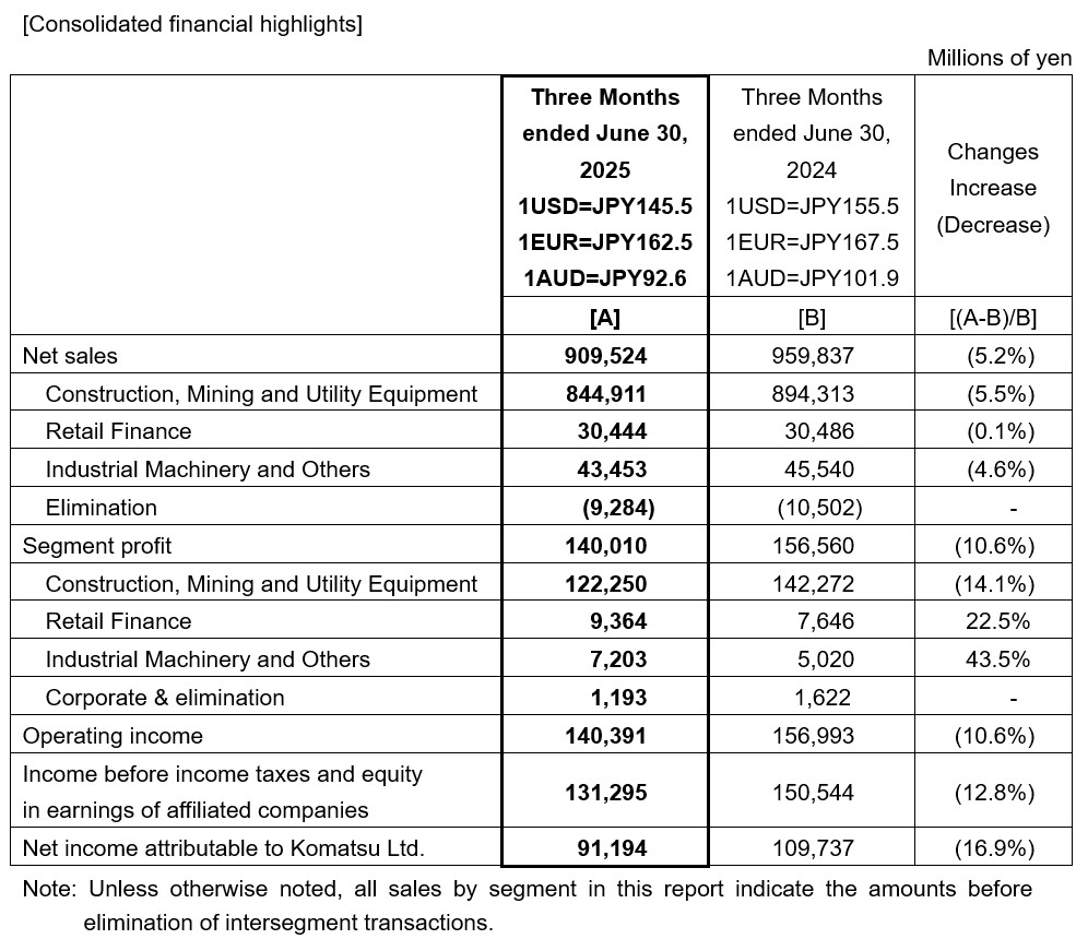 Komatsu Ltd. today announced its consolidated business results for three months of the fiscal year ending March 31, 2026 (U.S. GAAP). The highlights are described below.