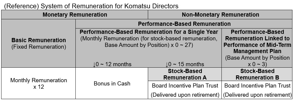 Komatsu Ltd. (“Komatsu”) hereby announces that it resolved at a meeting of the Board of Directors held today to continue the performance-linked stock-based remuneration system for its Directors (excluding the Outside Directors) (hereinafter “Komatsu Directors”) and employees in senior managerial positions such as Executive Officers (hereinafter “Komatsu Employees,” and collectively with Komatsu Directors, “Eligible Persons at Komatsu”).In addition, with regard to affiliated companies of Komatsu (hereinafter “Subject Affiliated Companies,” and collectively with Komatsu, “Subject Companies”), the performance-linked stock-based remuneration system for their Directors (excluding the Outside Directors) (hereinafter “Affiliated Company Directors,” and collectively with Eligible Persons at Komatsu, “Eligible Persons”) will continue in the same manner as that for Komatsu Directors. (hereinafter, the stock-based remuneration system for Eligible Persons will be referred to as the “Plan”).
