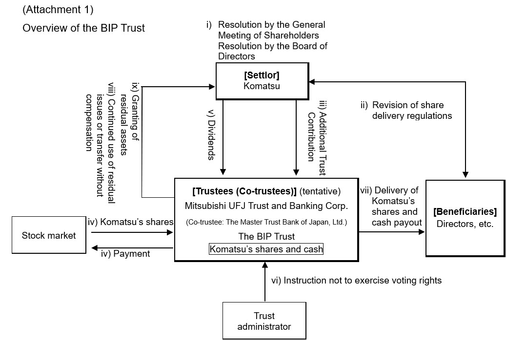 iii) Komatsu will entrust money for the remuneration of the Komatsu Directors and Affiliated Company Directors (hereinafter “Directors, etc.”) borne by the Subject Companies within the upper limit approved by a resolution at their respective Shareholders Meetings, and extend the trust period for the trust in which the Directors, etc. who meet the beneficiary requirements are beneficiaries (hereinafter the “BIP Trust”).